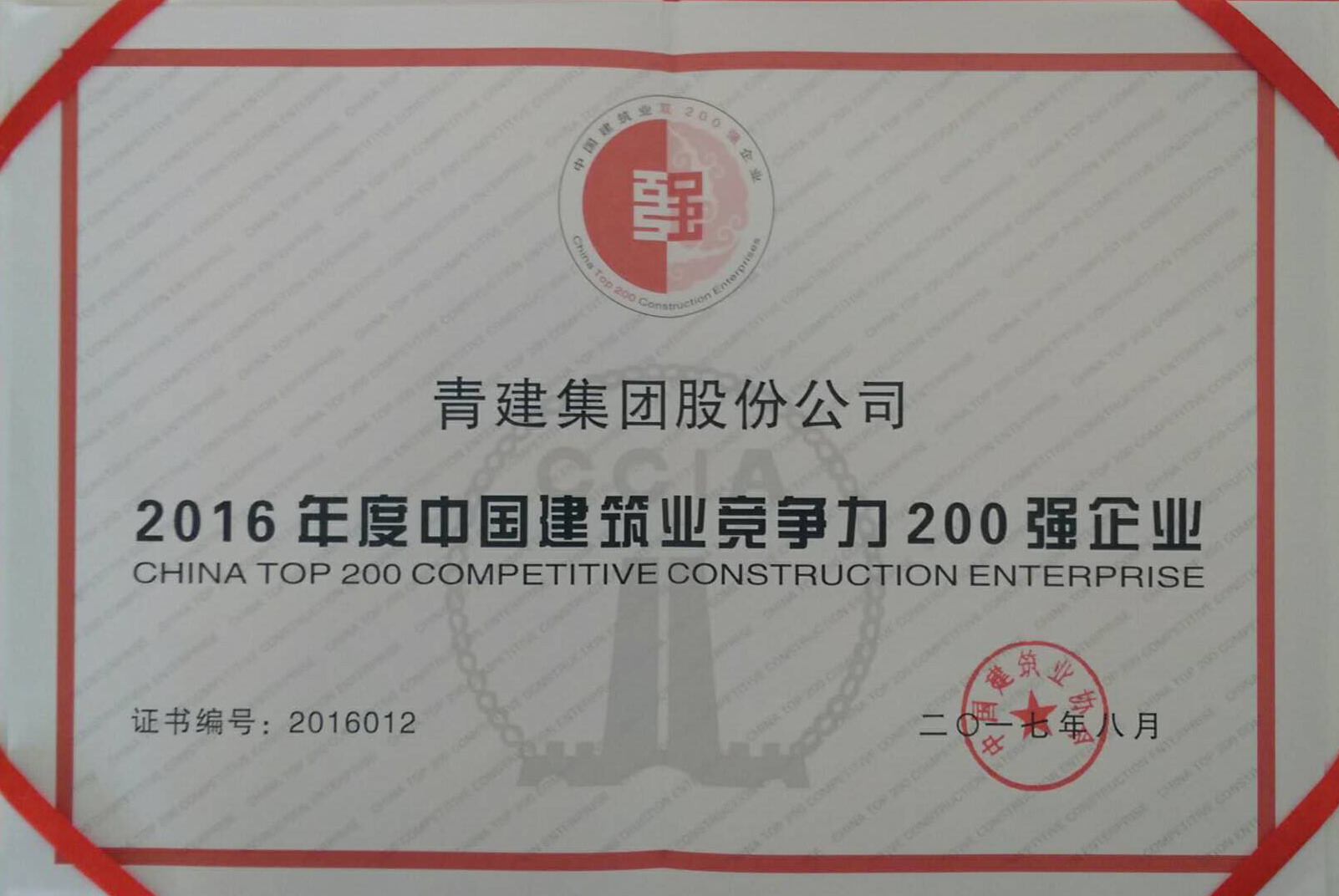 Qingjian Group was successively selected as China Top 200 Competitive Construction Enterprise