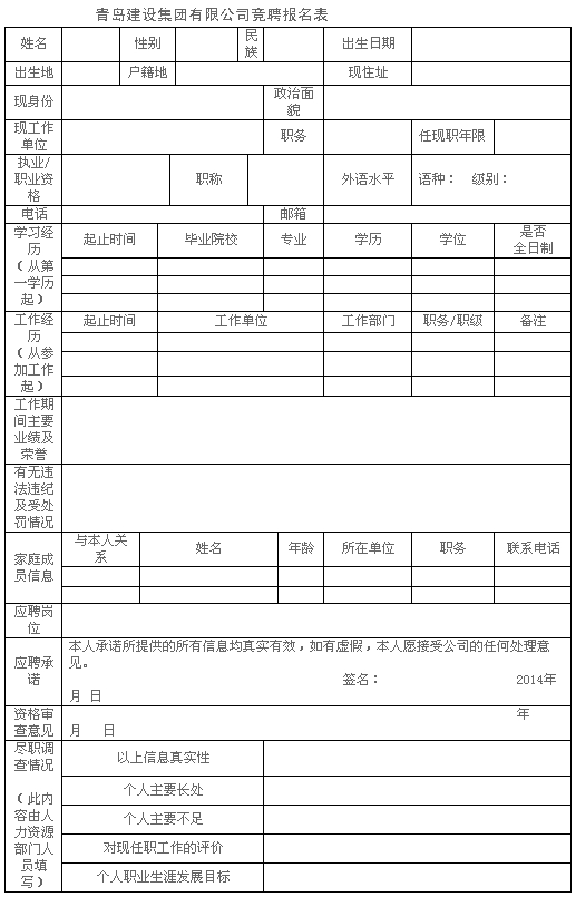 請下載附件中《青島建設(shè)集團有限公司競聘報名表》,按要求填寫后,于2014年9月9日12點之前將電子版和書面版報聯(lián)系人;隨報本人畢業(yè)證、學(xué)位證及現(xiàn)有職業(yè)、執(zhí)業(yè)資格證書、各類獲獎證書原件及復(fù)印件一份。