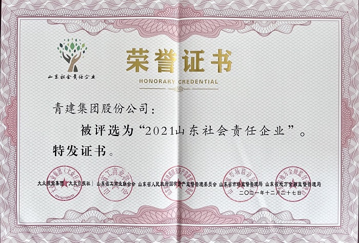 青建集團(tuán)股份公司獲評(píng)“2021山東社會(huì)責(zé)任企業(yè)”