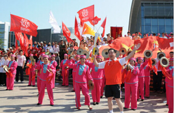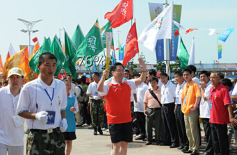 青島奧帆中心火炬?zhèn)鬟f現(xiàn)場,歡呼聲雷動,青島人民載歌載舞,用最熱烈、最隆重的儀式,共同迎接全運圣火的到來。10時32分,楊建強(qiáng)董事長作為第83號火炬?zhèn)鬟f手進(jìn)行全運圣火傳遞。楊建強(qiáng)董事長手擎如意火炬,點燃了迎全運、促和諧的熱情,在觀眾的歡呼聲中,將全運會圣火和“祝福祖國”的美好祝愿一路傳遞下去。