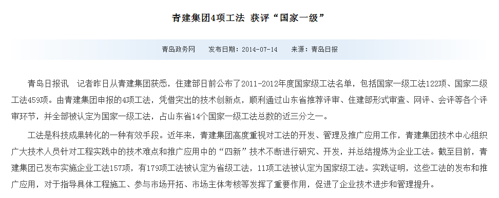 青島日報、青島政務網(wǎng)、大眾網(wǎng):青建集團4項工法 獲評“國家一級”