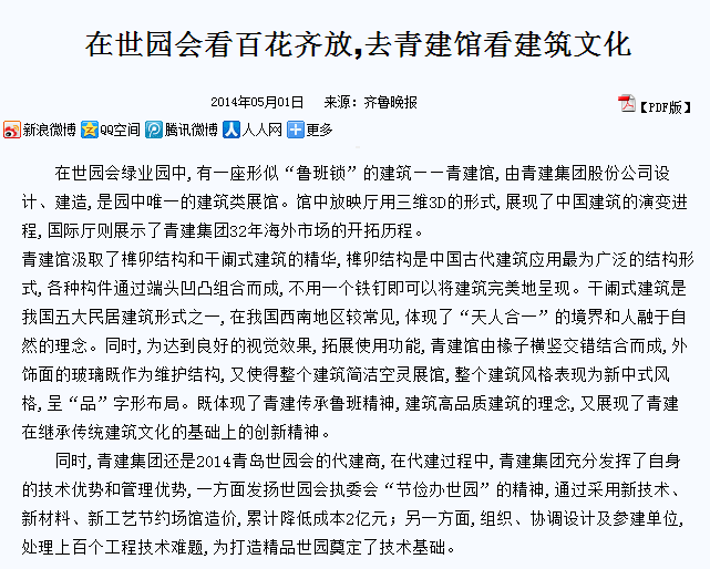 齊魯晚報(bào):《在世園會看百花齊放,去青建館看建筑文化》