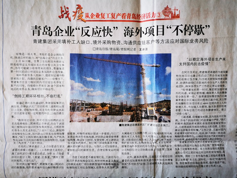 2月16日,青島日?qǐng)?bào)以“青島企業(yè)“反應(yīng)快”海外項(xiàng)目“不停歇”為題,報(bào)道了集團(tuán)采用填補(bǔ)工人缺口、境外采購(gòu)物資、溝通供應(yīng)鏈客人等方法英規(guī)國(guó)際業(yè)務(wù)風(fēng)險(xiǎn)。