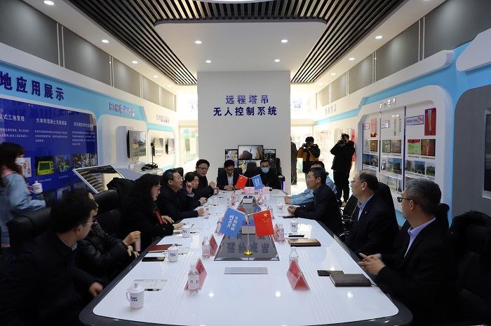 調(diào)研組一行首先來(lái)到青建山東頭社區(qū)改造項(xiàng)目,實(shí)地參觀了青建智慧展廳。吳書義書記對(duì)張?chǎng)H書記率調(diào)研組蒞臨青建表示熱烈歡迎,感謝各位領(lǐng)導(dǎo)長(zhǎng)期以來(lái)對(duì)青建的關(guān)心和支持,并同執(zhí)行總裁王樹利、青建智慧總經(jīng)理張超等向調(diào)研組一行匯報(bào)了集團(tuán)建筑工業(yè)化、數(shù)字化、智能化產(chǎn)業(yè)升級(jí)相關(guān)工作。隨后,調(diào)研組一行詳細(xì)了解了集團(tuán)智慧工地管理平臺(tái)、智能建筑機(jī)器人、無(wú)人塔吊、BIM數(shù)字孿生等在項(xiàng)目上的應(yīng)用。張?chǎng)H書記對(duì)青建通過(guò)新技術(shù)、新設(shè)備賦能項(xiàng)目管理并在降本增效、綠色低碳環(huán)保等方面發(fā)揮積極作用的做法表示肯定,鼓勵(lì)企業(yè)搶抓行業(yè)機(jī)遇,不斷拓展技術(shù)應(yīng)用范圍,加快推進(jìn)產(chǎn)業(yè)轉(zhuǎn)型升級(jí)發(fā)展。