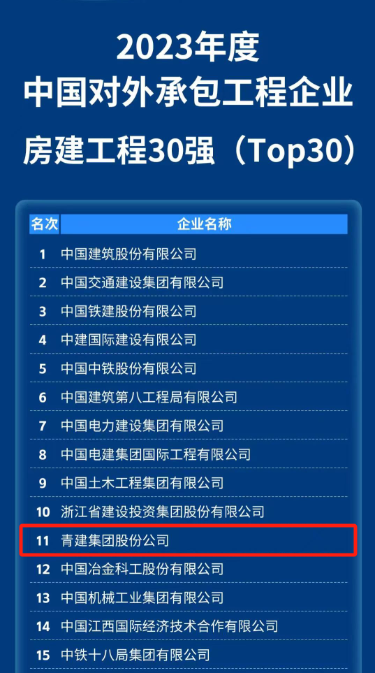 集團(tuán)繼續(xù)入選2023年度中國(guó)對(duì)外承包工程企業(yè)百?gòu)?qiáng),列房建工程30強(qiáng)第11位